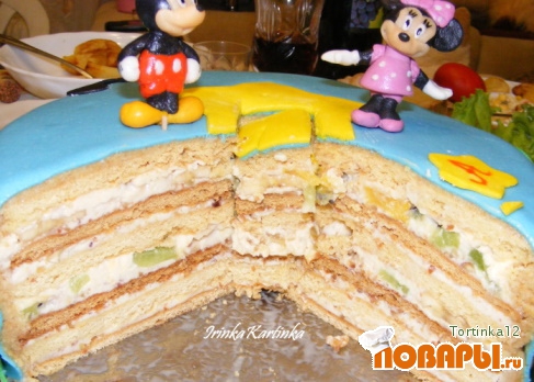 Форма у меня 24 см в диаметре,получается в среднем 6 коржей.Остывшие коржи перемазываем кремом,выкладываем фрукты,орехи.Если необходимо больше коржей,можно сделать 1,5 порции теста.На фото у меня торт из 1,5 порции,причем осталось 3 лишних коржа.Перемолола их в крошку,и половину я использовала выравнивания торта,а остаток крошки использовала позднее для основы Чизкейка))Так что применение таким вкусным коржам всегда найдется,можно их просто съесть со сгущенкой или вареньем))Приятного аппетита!