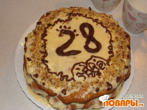 Мягкое для крема масло (лучше чтоб оно полежало часок в теплой комнате), желтки, сахарную пудру растереть, добавляя сметану. Готовые коржи промазать кремом и украсить на свое усмотрение. Я украсила к дню рождения муженька.
