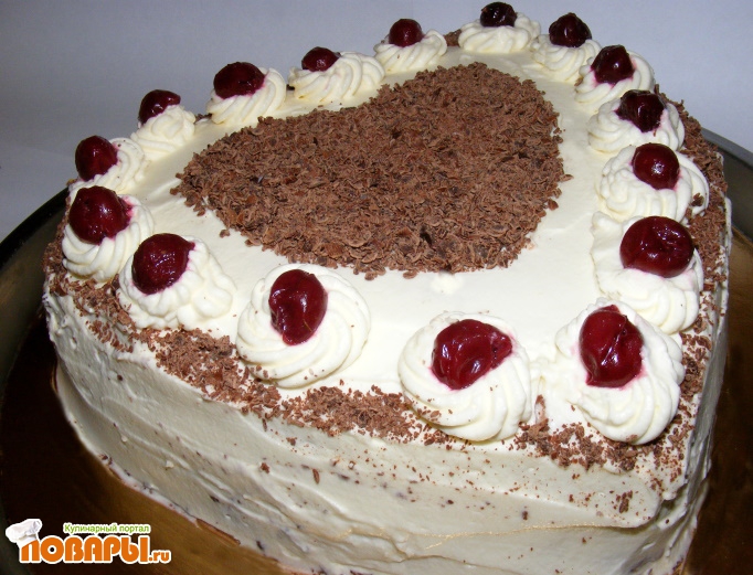 Остудить готовый бисквит, разрезать на три части. Нижний корж пропитать сиропом вишни с сахаром, можно добавить ложку коньяка. Выложить шоколадный крем, посыпать орехами. На следующий корж, также хорошо пропитанный сиропом, выкладываем густой сметано-творожный крем, выкладываем вишню. Накрываем верхним, третьим коржом, пропитываем и украшаем взбитыми сливками, вишней и тертым шоколадом.