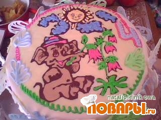 Пышки остывшие смазать кремом сам торт тоже обмазать кремом чтоб было ровно. Сверху положить слона, а по бока прикрепить бабочки.