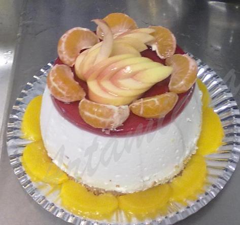 Смешать с остальным морсом, вылить форму (у меня – пластиковый круглый контейнер на 2 литра, можно использовать небольшую кастрюлю или разъемную форму, застеленную пищевой пленкой, но в ней сборка торта будет в обратном порядке – начиная с коржа). Поставить в холодильник застывать. Желательно оставить 1 ложечку желе в отдельной посуде, чтобы потом покрыть этим желе украшения из свежих фруктов.