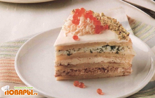 Оберните пищевой пленкой, сверху положите небольшой груз. Охлаждайте торт 12 часов. При подаче оформите торт тертым сыром, орехами и икрой.