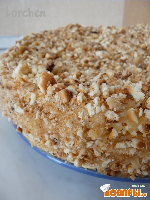 Обрезки коржей руками перетираем в крошку и добавляем измельчённые грецкие орехи. Хорошо обсыпаем торт. Тортику дать постоять часок-другой и можно кушать.