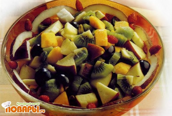 Можно подать такой салат, распределив его по вазочкам и дополнив шариками мороженого. Если вам нравится кокос, добавьте в салат кокосовую стружку. Персиковый ликер можно заменить бокалом шампанского с измельченным в пюре персиком.
