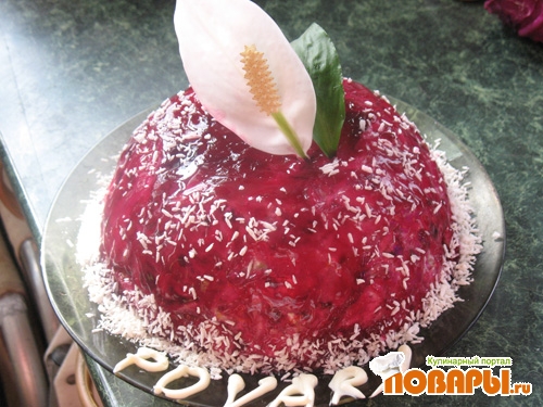 Готовим крем для заливки: желатин растворить горячим ананасовым сиропом и влить в йогурт. Добавить в крем кусочки ананасов, кокосовую стружку, если остался добавьте сюда же творожный крем.