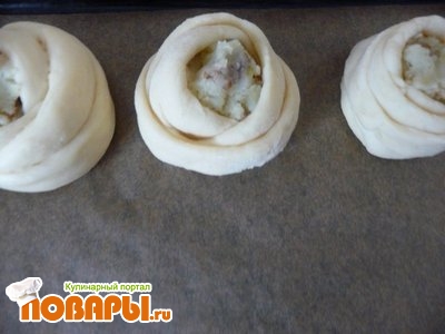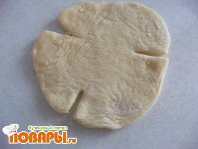 Каждый шарик раскатываем в лепёшку, делаем 3 разреза, в середину кладём немного начинки.