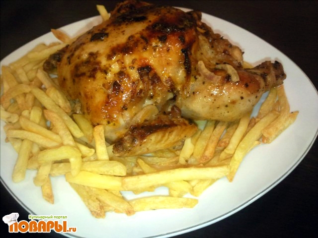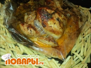 Кладём пакет с цыплёнком на противень и в духовку. Через минут 10-15 вокруг цыплёнка рассыпьте замороженный картофель фри. Не нужно добавлять масло или ещё что-то, картофель сам обжарится, в