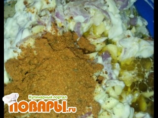 Разогреваем духовку до 180 градусов. Промываем цыплёнка или среднюю курицу, смотрим чтоб не осталось никаких перьев! Срезаем лишние куски кожи и несъедобные края крыльев. Отдельно готовим маринад - режем полукольцами лук, измельчаем чеснок. Добавляем туда оливковое масло, майонез, бальзамический уксус.