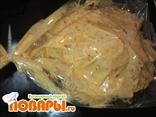 Всю эту смесь размешать и обмазать ею всего цыплёнка, внутри и снаружи. Желательно мариновать за пару часов до готовки, но и сразу без выдержки получается вкусно. Кладём цыплёнка и весь маринад в пакет для запекания, затягиваем потуже, протыкаем в центре ножом дырочку, чтоб пакет не лопнул.