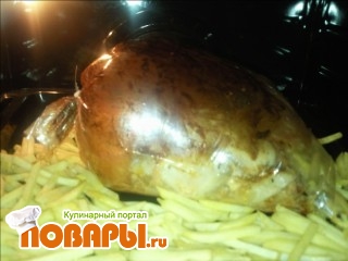 Периодически поглядывая, не переворачивая, готовим цыплёнка около часа, до золотистого цвета. Картофель можно перевернуть разок, и тоже готовить до золотистого цвета. Если картофель приготовится раньше - выньте раньше, а цыплёнок пусть готовится. Ничего страшного, что пакет будет чёрным изнутри, смотрите на цвет курочки. Как только цвет стал привлекательно-золотистым разрываем пакет в центре и достаём цыплёнка.