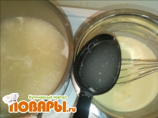 Всё перемешиваем венчиком. Далее обязательный этап - ставим чашку рядом с кастрюлей и постепенно, по пол половника, добавляем бульон в чашку с йогуртом, одновременно размешивая венчиком йогуртную массу. Так добавьте несколько половников бульона. После этого, также постепенно, вливаем всё из чашки обратно в кастрюлю.