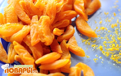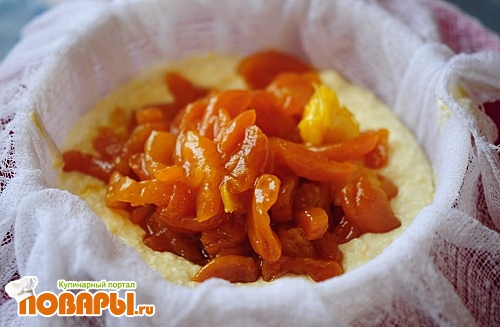 Я не стала перемешивать курагу с общей творожной массой, у меня немного не обычный порядок, часть творожной смеси, затем курага, и после еще творожная масса. Таким образом курага будет как вкусная начинка. Даже скажу больше, курагу я поварила с апельсиновыми дольками и сахаром, но это не обязательно.