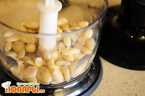 Миндаль подержать в кипятке, отделить от шкурки, подсушить и размельчить например в блендере.