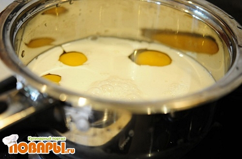 Теперь можно начать готовить Пасху. Для этого в кастрюльку выльем сливки, добавим 2 яйца, сахар. Поставим все на газ, на мелкий огонь и постоянно мешать. Как только жидкость начнет густеть, выключаем и оставляем в сторону.