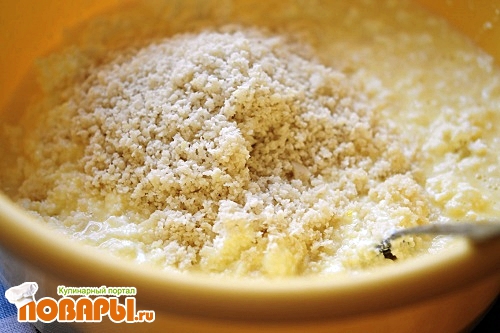 Творог, масло сливочное, цедру, молотый миндаль выкладываем в отдельную посуду, заливаем ранее приготовленной сливочной жидкостью.