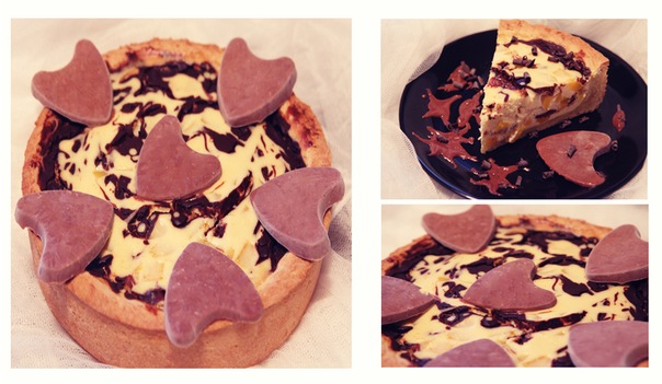 Поочередно ложкой выливаем на тесто белую и темную начинку. Остатки темной начинки(если останется я разлила для декора в формочки сердечки