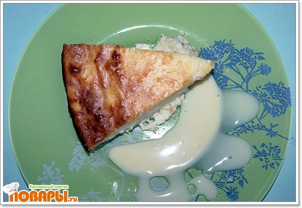 Когда запеканка немного остынет, нарезать на порции и подавать со сметаной, сгущеным молоком или джемом.