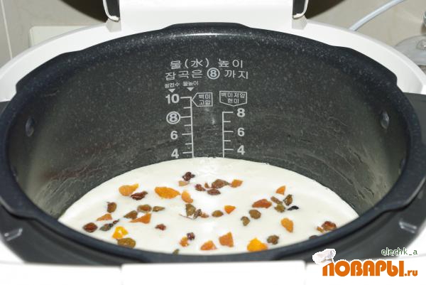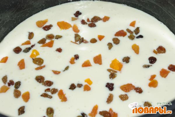 Взбиваем яйца с сахаром и ванильным сахаром. Добавляем творог, манку и разрыхлитель. Смазываем сливочным маслом форму мультиварки и выливаем тесто. Добавляем изюм, курагу.