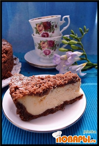 Для посыпки муку смешать с какао, кофе и сахаром. Добавить наструганное сливочное масло и все быстро порубить ножом до состояния мелкой крошки. Посыпку равномерно распределить на творожной начинке и поставить в духовку на 45-50 минут.