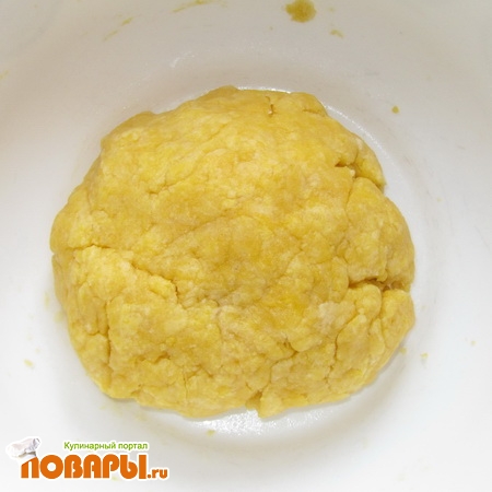 Желтки смешиваем с растопленным и немного остуженным маслом, двумя столовыми ложками сахара, разрыхлителем, мукой, замешиваем песочное, крутое тесто и ставим в холодильник.