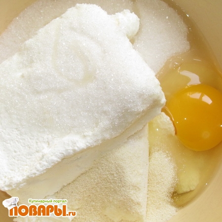 Делаем начинку. Для этого, любым способом следует смешать: творог, манку, ванилин, пол стакана сахара, сметану одно яйцо.
