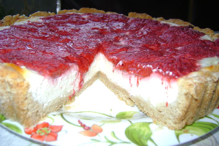 В форму на тесто выложить творожную начинку, сверху ягоды. Поставить в духовку на 1800 на 45-50 минут