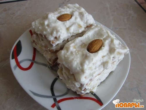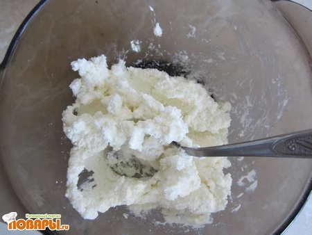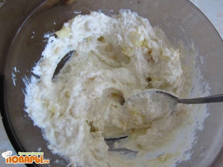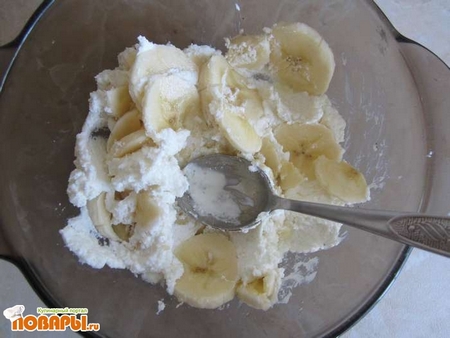 Тщательно разминаем банан, долго и тщательно перемешиваем, взбиваем бананово-творожный крем. Дальше добавляем измельченный ананас.