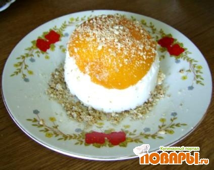 Или еще один вариант: сначала кладем на дно формочек половинки персиков, а потом заливаем творожной массой. Достаем, выкладываем порционно на тарелки и украшаем.