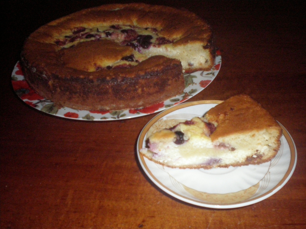 Я не добавляла фрукты в творожную массу, только изюм. А фрукты замороженные прям с морозилки посыпала сверху (у меня были смородина, крыжовник и клубника, но можно любые по желанию). После выпечки середина ещё немного была жидкая, но после того, как постояла в горячей духовке, стала то, что надо. Пирог просто обалденно вкусный!!!