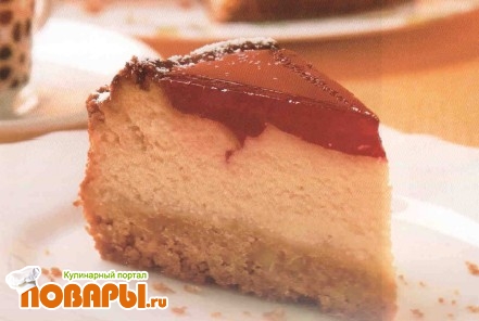 Желатин смешайте с вишневым сиропом, вылейте смесь на выпеченный торт и охлаждайте 5-12 часов. При подаче выньте торт из формы, удалите бумагу для выпечки, уложите торт на блюдо и нарежьте на порции.