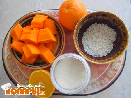 Тыкву необходимо очистить от шкурки и порезать небольшими кусочками. Затем положить в кастрюлю, залить водой и варить на небольшом огне до готовности. Когда тыква сварится и будет мягкой, слить воду и помять ее, чтобы получилась однородная каша без кусочков. Далее ставим тыквенную кашу на маленький огонь и добавляем сахар, ванильный сахар и рис, так, чтобы он оставался на поверхности. Необходимо кастрюлю поставить на маленький огонь и накрыть крышкой. Не забывать периодически помешивать.