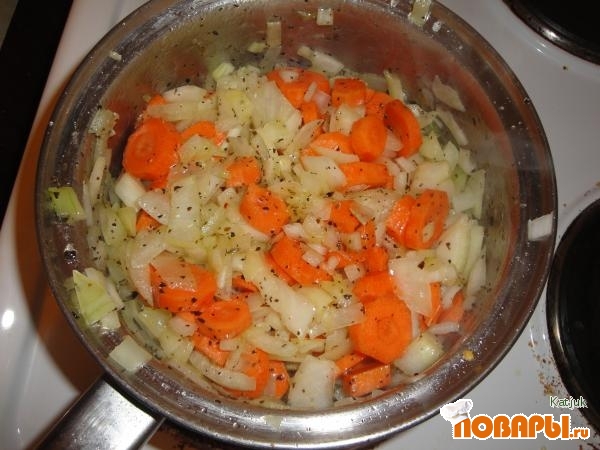 Когда масло на плите разогрелось, высыпаем лук и морковь. И тушим минутак 5 на небольшом огне.