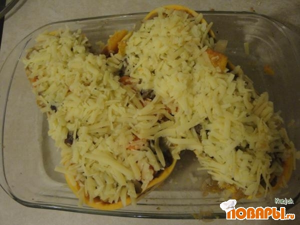 Когда в кострюле все хорошенька потушилось, наполняем наши лодочки и сверху обильно посыпаем сыром. Ставим в разогретую духовку при температуре 200 градусов и оставляем там на минут 20-25.