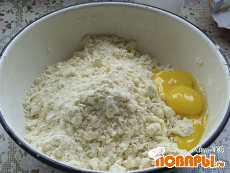 Готовим тесто. Смешиваем муку с сахаром, натираем на крупной терке маргарин. Добавляем к сахарно-мучной смеси. Все тщательно перетираем руками, до образования маслянистой крошки. Отделяем белки от желтков. Белки отправляем в холодильник, желтки замешиваем в тесто. Получается тяжеленький колобок. Раскатываем тесто по форме для выпекания.