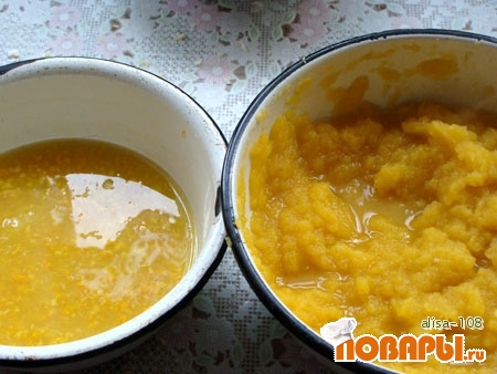Натираем на мелкой терке цедру лимона и апельсина и тут же выжимаем из них сок. Тыкву пюрируем, добавляем сок и цедру, крахмал и желатин. Провариваем все на медленном огне до загустения тыквенного пюре.