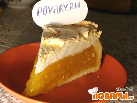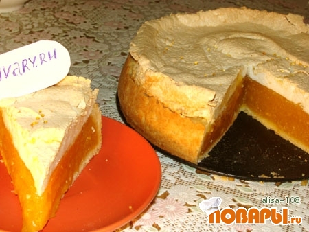 Вынимаем пирог из духовки и выкладываем взбитые белки. Запекаем пирог на верхней полке еще 20-15 мину, пока белки не станут розоватого цвета.