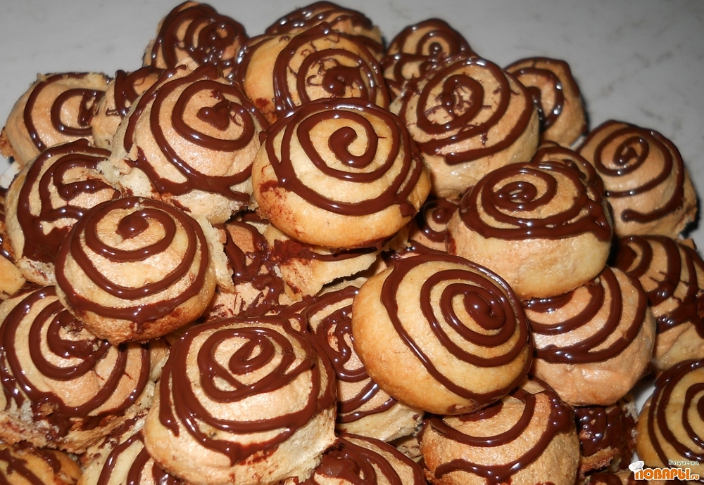Из готового охлаждённого теста делаем шарики величиной с грецкий орех смачиваем их во взбитых белках и вылаживаем на подготовленный протвень.Выпекаем при температуре 180градусов 30-40 минут.Готовое печенье охладить и украсить растопленным шоколадом.