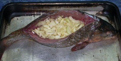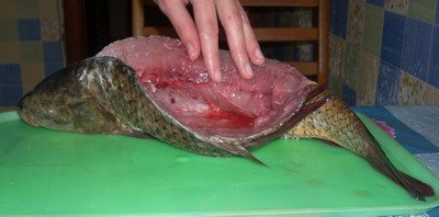 Сазана очищаем от чешуи. Надрезаем вдоль спины, достаем из него хребет и все внутренности (нужно, чтобы брюхо осталось целым).