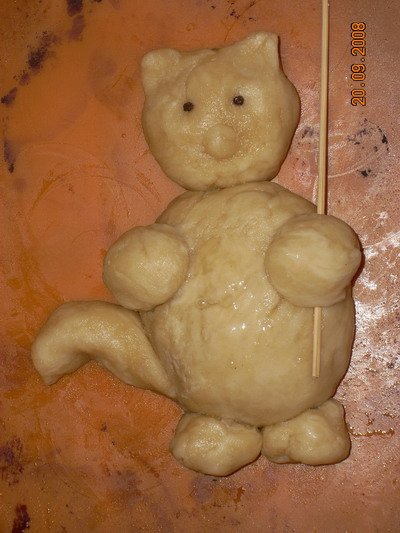 Теперь вспоминаем счастливое детство и как из пластилина в детском садике вылепливаем кота. Чтобы голова держалась, втыкаем в тело зубочистку и насаживаем на нее голову. Вместо глаз используем черный перец горошком.