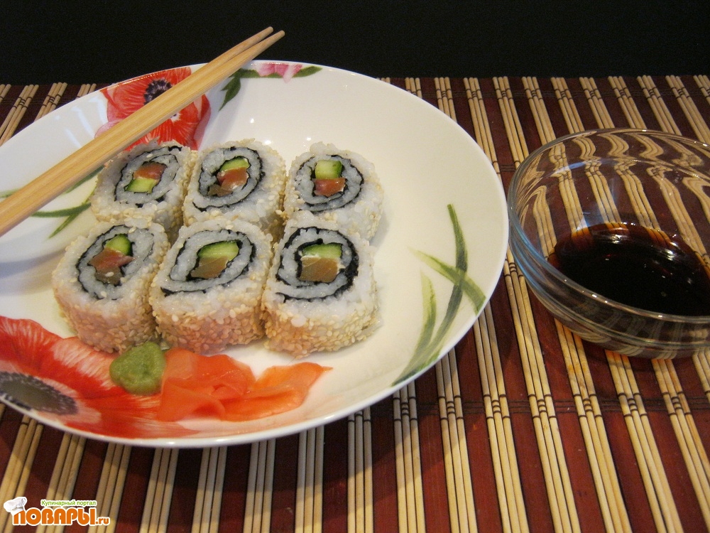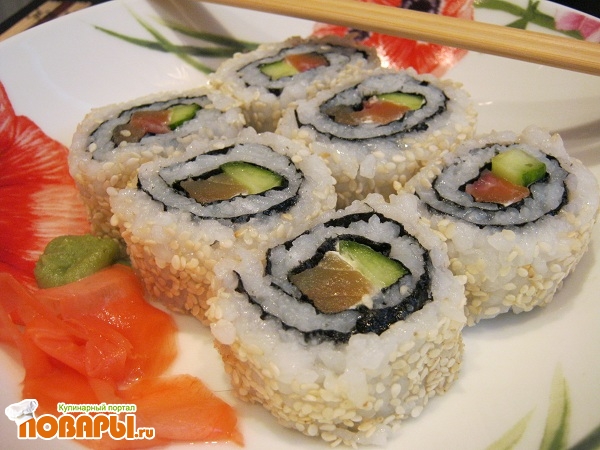 Любителям восточной кухни посвящается… В последние несколько лет интерес к восточной кухне не только не ослабел, но и приобрел новые тенденции - из ресторанов, баров и закусочных секреты приготовления такого необычного для русского стола вида яств, как суши и роллы, перекочевали в руки обычных хозяек. Кроме того, им в помощь прилавки магазинов изобилуют всеми необходимыми ингредиентами, поэтому не составляет труда устроить вечер японской кухни у себя дома. В данном рецепте приведены фото-шаги приготовления вида ролов, который не особо отличается от самых обычных роллов с лососем и огурцом по сути, но выглядит совсем иначе. Речь идет о роллах урамаки, обязанных своему появлению брезгливости европейцев, которых вид водорослей нори не удовлетворял с эстетической точки зрения - так появились роллы рисом наружу.