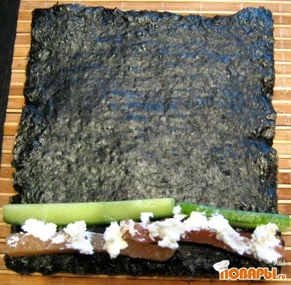 Аккуратно с помощью коврика переворачиваем лист нори вместе со слоем риса (в этом действии и заключен секрет получения иного внешнего вида роллов) и укладываем порезанные на брусочки огурец, лосось и творожный сыр на край нори.