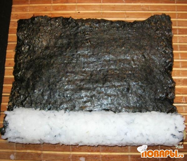 На лист нори, разложенный гладкой стороной вниз на циновке, выкладываем теплый рис ровным тонким слоем.