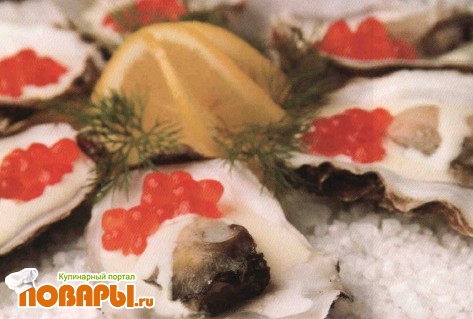 Ракушки промойте, обсушите, положите в каждую мякоть устрицы, полейте небольшим количеством приготовленного соуса, оформите икрой.
