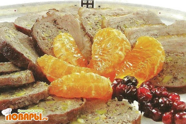 При подаче разложите веером на блюде, рядом уложите дольки мандаринов и бруснику.