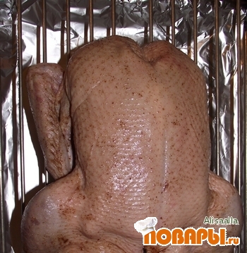 отправляем в духовку на решетку, а вниз на противень наливаем воды и накрываем фольгой, и оставляем утку на большом огне (примерно 250 градусов) на 1 час 20 минут;