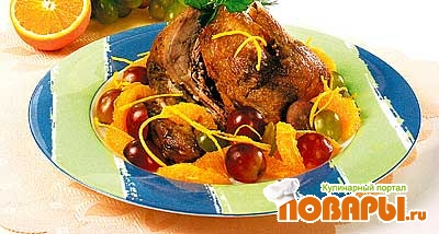 Жарить утку в горячей духовке 1.5-2 часа. Тем временем бланшировать цедру в течение 10 минут в кипящей воде. Дать стечь воде и растолочь цедру вместе с утиной печенью, влить апельсиновый ликер. Налить в кастрюлю бульон из телятины и концентрированный мясной сок, положить сливочное масло, смешать с мукой и цедрой, толченной с апельсиновым ликером. Довести до кипения, процедить.