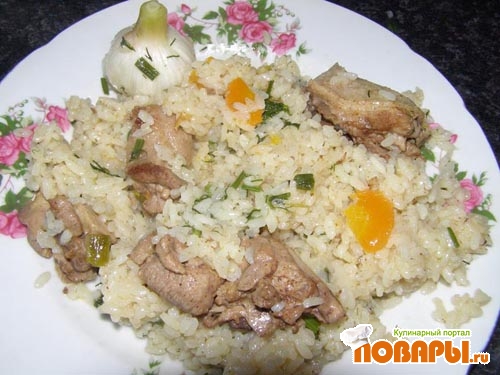 Посолим, посыпаем любимыми специями, сверху засыпаем промытым рисом. Воткнем в рис несколько головок чеснока и зальем всё это кипятком.
