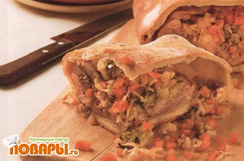 утка 1 шт. яблоки 2 шт.капуста белокочанная 100 г лук репчатый 1 головка морковь 1 шт. капуста цветная 100 г капуста брокколи 100 г семена тмина 1 /2 ч. ложки перец черный молотый сольДля теста:мука пшеничная 1 стакан крупа манная 1 стакан кефир, пиво по 1/2 стакана вино красное сухое 2 ст. ложки