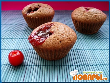Смешать муку, какао и разрыхлитель, апельсиновую цедру. Добавить к яично-масляной смеси. - Вымесить тесто - Формочки наполнить на 1/3 тестом , сверху каждого маффина выложить по одной чайной ложке вишневого джема. - Выпекать 15-20 минут.