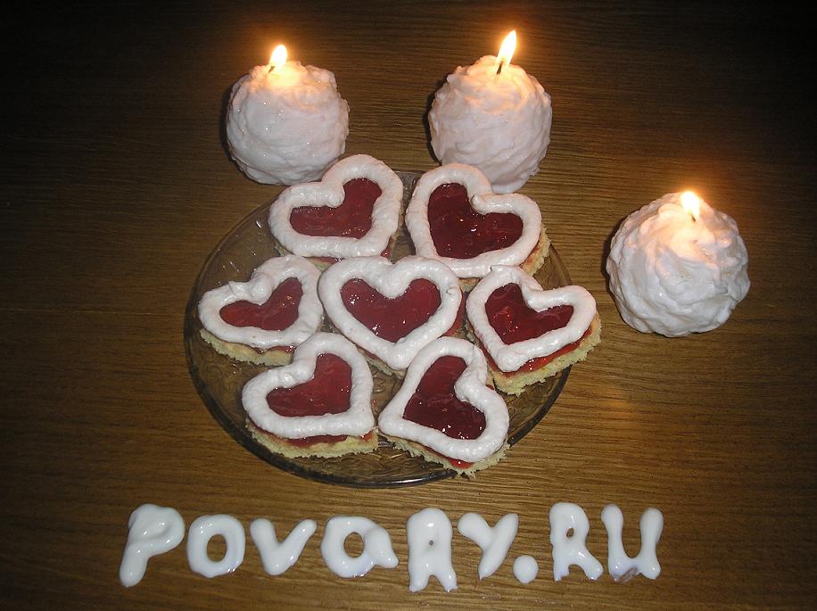 Вынуть сердечки, разложить их на корже. По размеру безейных сердечек, вырезать сердечки из коржа. Затем сердечки из коржа с одной стороны обмазываем джемом и сверху кладем безе. Валентинки готовы.